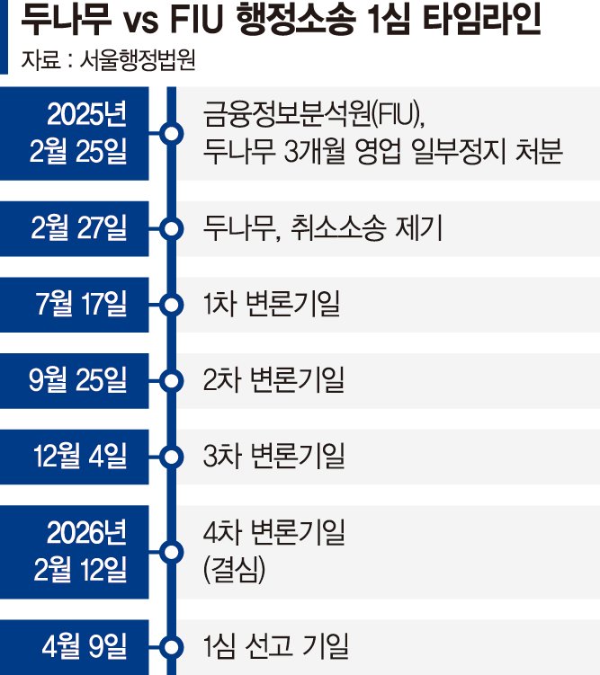FIU는 지난 2월 두나무가 해외 미신고 가상자산사업자와 거래하거나 고객확인(KYC) 의무를 위반하는 등 특정금융정보법(특금법) 위반 사실이 적발됐다며 3개월 영업 일부정지 처분을 내렸다. 이에 두나무는 같은 달 행정소송을 제기하며 대응에 나섰다.