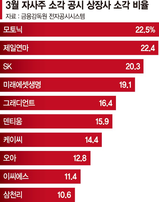 6일 한국거래소에 따르면 지난 3월 한 달간 주주총회 등에서 자사주 소각을 결정한 상장사는 102개사이고 금액으로는 총 15조8000억원에 이른다. 주식 소각 공시 기준으로 전년 동월 대비 159% 급증한 수치로, 이례적인 수준이다.