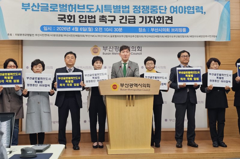 지방분권균형발전부산시민연대 등은 6일 오전 부산시의회 브리핑실에서 기자회견을 열고 부산글로벌허브도시특별법의 조속한 국회 통과를 촉구하고 나섰다. 이 법은 최근 국회 상임위원회인 행정안전위원회를 통과했으나 법제사법위원회(법사위)의 심사를 기다리고 있다. 그러나 법사위 개최 시기 미정으로 지방선거 이후 진행될 가능성도 점쳐지고 있다.