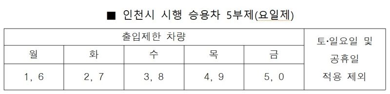 【파이낸셜뉴스 인천=한갑수 기자】 인천시는 자원안보 위기 ‘경계’ 단계 발령에 따라 에너지 절감과 수요 관리를 위해 오는 8일부터 지역 내 공영주차장을 대상으로 승용차 5부제(요일제)를 시행한다고 7일 밝혔다.