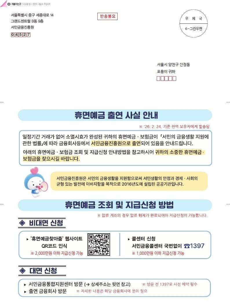 휴면예금 원권리자는 2000만원 이하인 경우 창구 방문 없이 서금원 '서민금융 잇다' 앱 또는 '휴면예금 찾아줌' 웹사이트 등에서 평일 24시간 휴면예금을 찾을 수 있다.