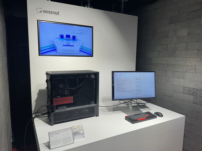 와이즈넛이 부스에서 시연한 인공지능(AI) 어플라이언스는 퓨리오사AI의 고성능·고효율 NPU 레니게이드 위에 검색증강생성(RAG) 기반 AI 에이전트 솔루션 '와이즈 iRAG'와 도메인 특화 대규모언어모델(LLM) '와이즈 LLOA'를 통합한 일체형 장비다.