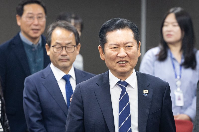 정청래 더불어민주당 대표가 7일 서울 여의도 국회 의원회관에서 열린 더불어민주당 기본사회위원회 3기 출범식에 참석하고 있다. 뉴스1