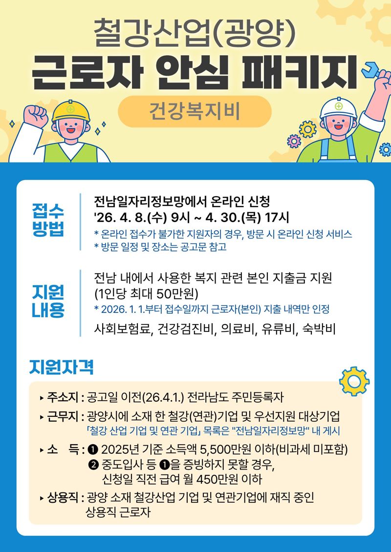 광양시 관계자는 "철강 산업은 지역 경제의 핵심 기반으로, 근로자의 고용 안정이 산업 경쟁력으로 이어진다"면서 "이번 사업이 현장 근로자의 생활 안정에 도움이 되기를 바란다"라고 말했다.