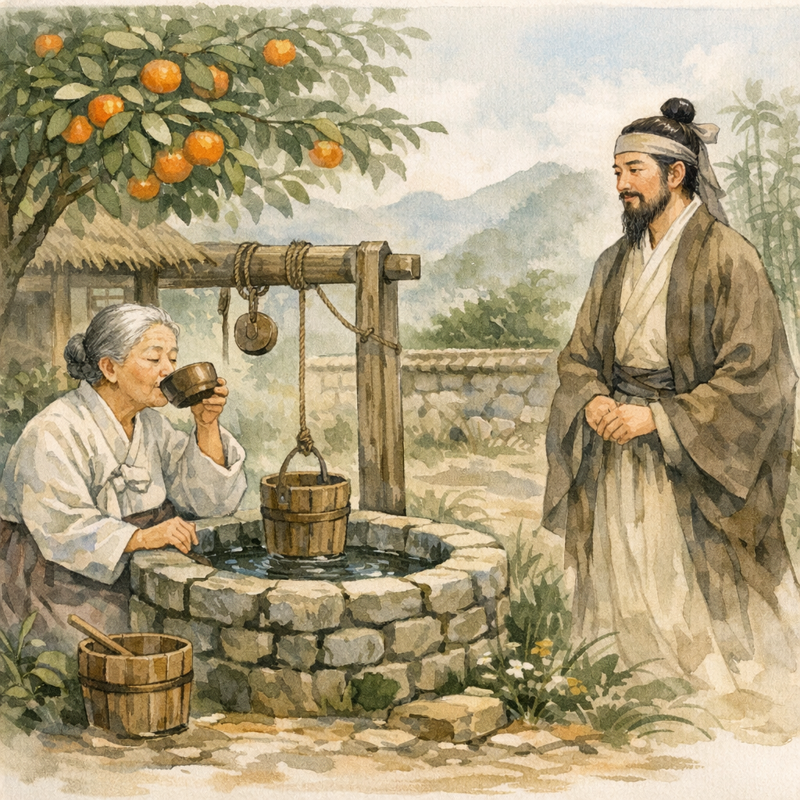 정말 다음 해에 역병이 돌았다. 어머니는 물론이고 마을 사람들은 집의 뒤뜰에 있는 우물물을 마시고 귤잎을 먹자 역병에 걸리지 않았다. 역병에 걸린 사람들도 바로 나았다. 이 우물물과 귤잎을 구하는 자가 멀리 천 리 밖에서도 왔다.
