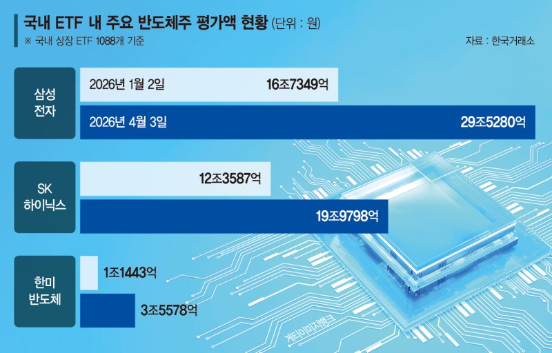 삼성전자와 SK하이닉스를 제외하고도 ETF 시장에서 반도체주의 위력은 커진 모습이다. 국내 ETF에서 한미반도체 평가액은 올해 초 1조1443억원으로 비중이 0.38%에 불과했지만, 지난 3일 3조5578억원(0.94%)으로 불어나면서 평가액 3위에 이름을 올렸다.