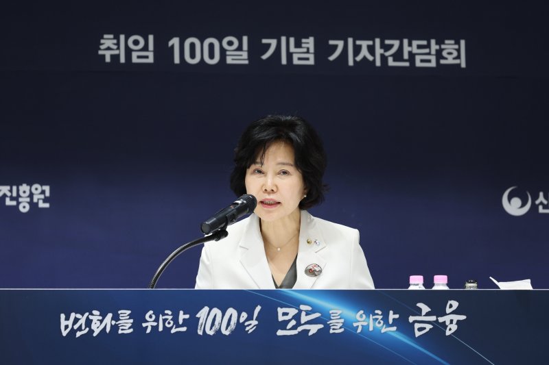 김은경 서민금융진흥원장이 7일 서울 중구 그랜드센트럴에서 열린 취임 100일 기자간담회에서 인사말을 하고 있다. 연합뉴스