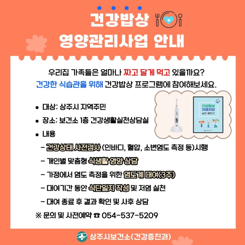 (안동=뉴스1) 김대벽 기자 = 경북 상주시보건소는 8일 주민들의 올바른 식습관 형성과 만성질환 예방을 위해 ‘건강밥상’ 영양관리사업을 추진한다고 밝혔다.