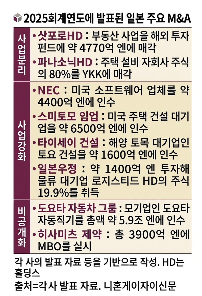 도요타자동차 그룹의 모태 기업인 도요타자동직기가 비상장화를 목표로 지난달까지 진행한 총 5조9000억엔 규모의 공개매수(TOB)와 히사미쓰제약의 경영진 자사주 매입(MBO) 역시 적대적 인수를 방지하거나 장기적 관점의 성장 투자를 확대하기 위한 것이다.
