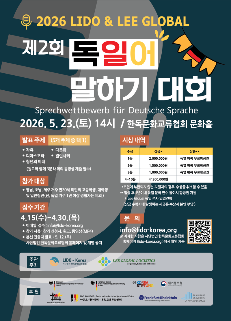 한독문화교류협회 관계자는 "청년들이 독일어를 통해 더 넓은 세계를 상상하고 자신의 미래를 구체적으로 설계해보는 무대가 되길 바란다"고 밝혔다.