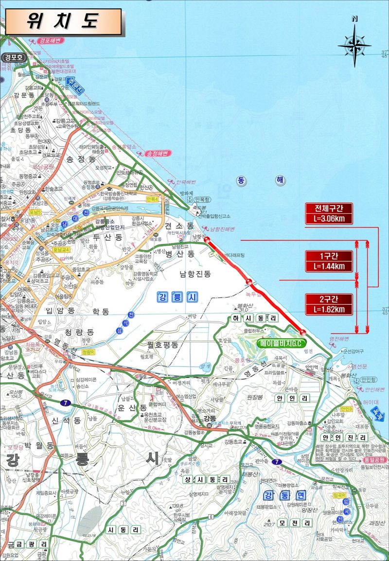 8일 강릉시에 따르면 이 사업은 동해안의 대표적인 단절 구간을 연결해 새로운 해양 관광 루트를 조성하고 지역 주민들을 위한 '20분대 생활권 도로망'을 확충하기 위해 마련됐다. 그동안 해당 구간은 공군 제18전투비행단의 작전 지역과 보안 시설로 인해 도로 개설에 어려움이 있었으나 시는 군과 협의 끝에 총 연장 3.06㎞의 노선을 확정하고 지난해 10월 도로 조성을 위한 업무 협약을 체결했다.