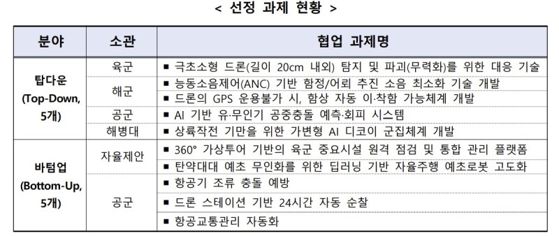 탑다운 과제에는 육군의 극초소형 드론 탐지·무력화 기술, 해군의 함정·어뢰 추진 소음 최소화 기술, 공군의 AI 기반 유·무인기 공중 충돌 예측·회피 시스템 등이 선정됐다. 바텀업 과제는 360도 가상투어 기반 육군 중요시설 원격 점검·통합관리 플랫폼, 탄약대대 예초 무인화를 위한 딥러닝 기반 자율주행 예초로봇 고도화 등이 포함됐다.