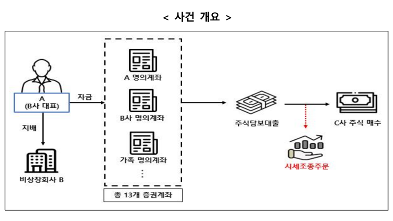 금융당국 조사 결과에 따르면, A씨는 비상장 B사의 대표로 본인과 가족, 법인 명의의 계좌 총 13개를 이용해 C사 주식을 타깃으로 삼았다.