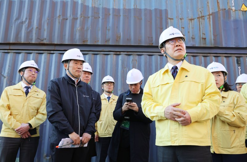[의왕=뉴시스] 고범준 기자 = 이재명 대통령이 8일 경기 의왕 내륙컨테이너 기지를 방문해 고유가 위기극복을 위한 화물운송·물류업계 현장 간담회를 마친 뒤 현장을 시찰하고 있다. 2026.04.08. bjko@newsis.com [서울=뉴시스]최동준 조재완 김경록 기자 = 이재명 대통령은 8일 고유가로 어려움을 겪는 화물차주를 위한 소상공인 대출 지원 제도를 개선하라고 지시했다.
