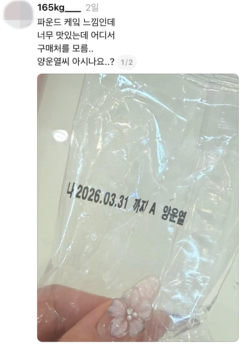 해당 게시물을 올린 A씨는 "파운드 케이크 느낌인데 너무 맛있다. 그런데 구매처를 모른다"고 적었다. 그러면서 제품 포장 봉투를 찍은 사진에 인쇄된 이름에 주목해 "양운열씨 아시나요"라고 마무리했다.