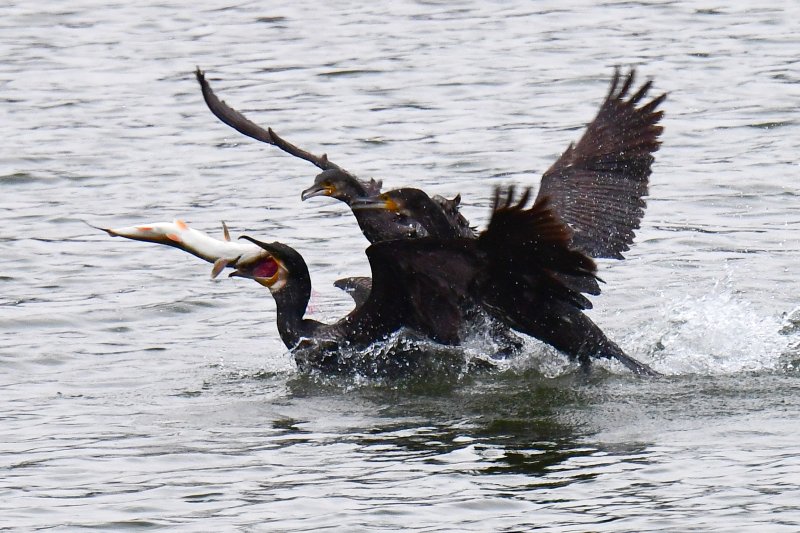 황어 회귀 시기에 맞춰 가마우지들이 무리를 지어 강으로 몰려와 치열한 생존 싸움을 벌이고 있다.