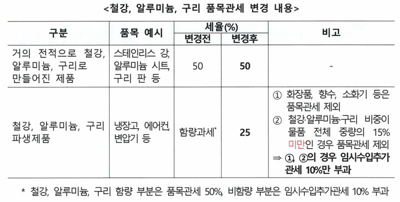 미국 정부의 철강·알루미늄·구리 품목관세 공고 변경내용에 따르면 철강·알루미늄·구리 제품 및 파생제품의 전체 가격에 대해 25% 또는 50% 품목관세가 부과된다. 기존에는 철강, 알루미늄, 구리의 함량 가치과 비함량 가치를 구분하여 함량 부분에는 품목관세 50%, 비함량 부분에는 임시수입추가관세 10%를 각각 부과했다.