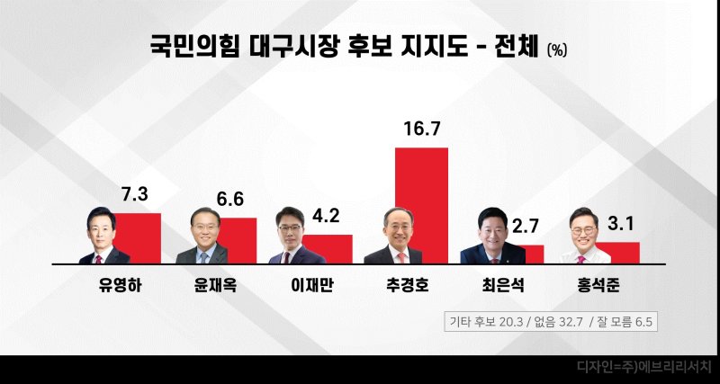 9일 뉴스1 코리아 대구경북취재본부와 ㈜에브리뉴스가 ㈜에브리리서치에 의뢰해 실시한 여론조사에서 국민의힘 대구시장 경선 주자 중 추 의원이 16.7%로 가장 앞섰고, 유영하 의원 7.3%, 윤재옥 의원 6.6%, 이재만 전 대구 동구청장 4.2%, 홍석준 전 의원 3.1%, 최은석 의원 2.7% 순이다.
