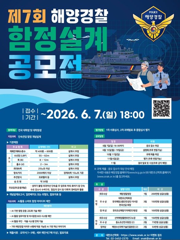 전국 대학(원)생은 6월 7일까지 참가 신청을 받을 수 있으며, 세부 일정과 참가 방법은 해경청 및 대한조선학회 누리집을 확인하면 된다.