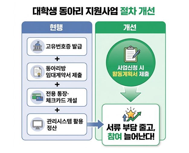규제개선 169호는 대학생 동아리가 서울시 시정 가치와 연계한 사회기여 활동에 참여할 때 필요한 서류절차를 줄인다. 기존 통장 개설, 고유번호증 발급, 동아리방 임대차계약서(무상사용승낙서) 등 서류 6종이 필요했던 신청 및 교부 절차를 올해부터는 3종으로 대폭 간소화했다. 전문수행기관을 선정해 동아리 활동비 집행·정산 지원은 물론 동아리 활동 계획에 대한 컨설팅도 제공할 계획이다.