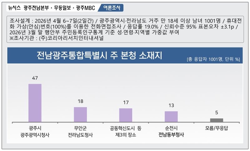 9일 뉴시스 광주전남본부와 무등일보, 광주MBC가 코리아리서치인터내셔널에 의뢰해 이달 6일부터 이틀간 전남·광주에 사는 만18세 이상 남녀 1001명을 대상으로 한 여론조사에서 응답자 47%는 전남광주통합특별시 주 청사가 광주시청이 돼 한다고 답했다.