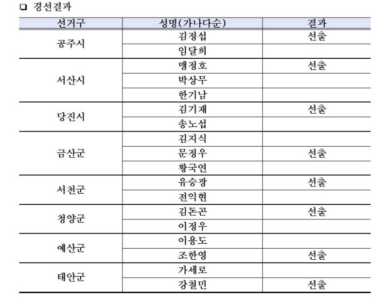 이에 따르면 △공주시 김정섭 △서산시 맹정호 △당진시 김기재 △금산군 문정우 △서천군 유승광 △청양군 김돈곤 △예산군 조한영 △태안군 강철민 후보가 각각 경선을 통과했다.