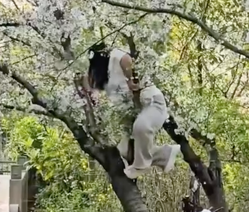 9일 현지 매체와 사회관계망서비스(SNS) 등에 따르면 따르면 최근 상하이 바오산구에 위치한 구춘공원을 찾은 한 여성 관광객이 벚나무 가지 위로 올라가 포즈를 취하던 중 나무가 갑자기 균형을 잃고 쓰러졌다. 나무가 여성의 체중을 이기지 못한 것으로 보인다.