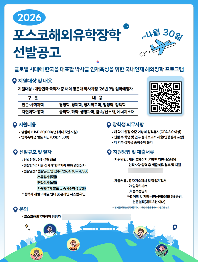올해 9월 해외 명문대 박사과정 대상 장학생 모집