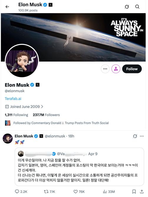 머스크는 지난 9일 오후 한 한국어 이용자가 작성한 글을 리포스트 했다. 별도의 메시지는 없었고 로켓 이모지 두 개를 덧붙였다.
