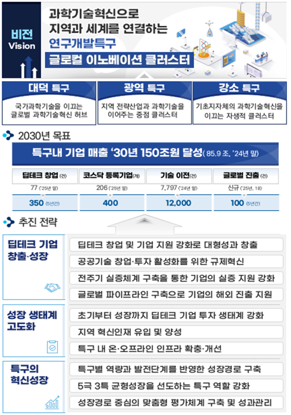 이번 계획의 비전은 '과학기술혁신으로 지역과 세계를 연결하는 연구개발특구 글로컬 이노베이션 클러스터'로, △딥테크 기업 창출·성장, △성장 생태계 고도화, △특구의 혁신성장의 3대 정책과제와 10개의 세부 추진과제를 추진한다.