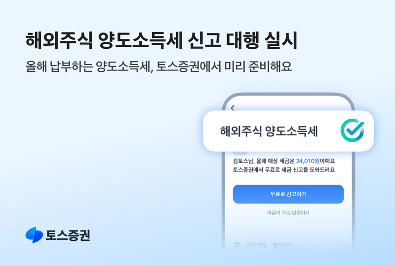[파이낸셜뉴스] 토스증권이 지난해 해외주식 투자수익 250만원 초과 고객을 대상으로 '해외주식 양도소득세 신고 대행 서비스'를 이달 28일까지 진행한다.