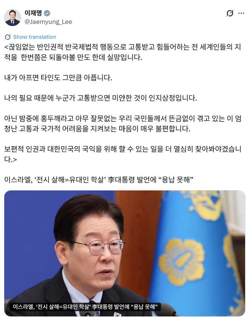 이 대통령은 이날 엑스(X·구 트위터)에 <이스라엘, '전시 살해=유대인 학살' 李대통령 발언에 "용납 못해">이라는 제목의 언론 기사를 공유하고 이같이 썼다.