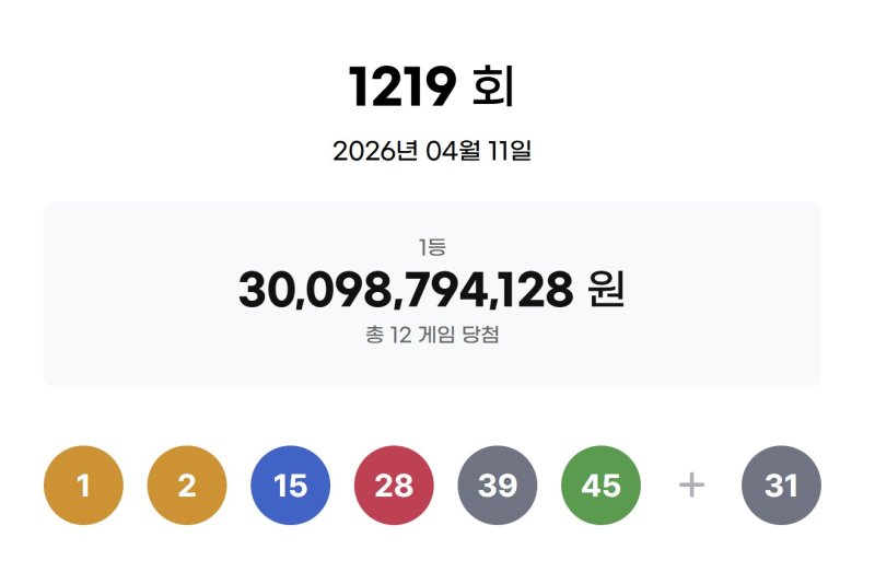 [서울=뉴시스]신유림 기자 = 11일 제1219회 동행복권 로또 추첨 결과 '1, 2, 15, 28, 39, 45'이 1등 당첨 번호로 결정됐다. 2등 보너스 번호는 '31'이다.