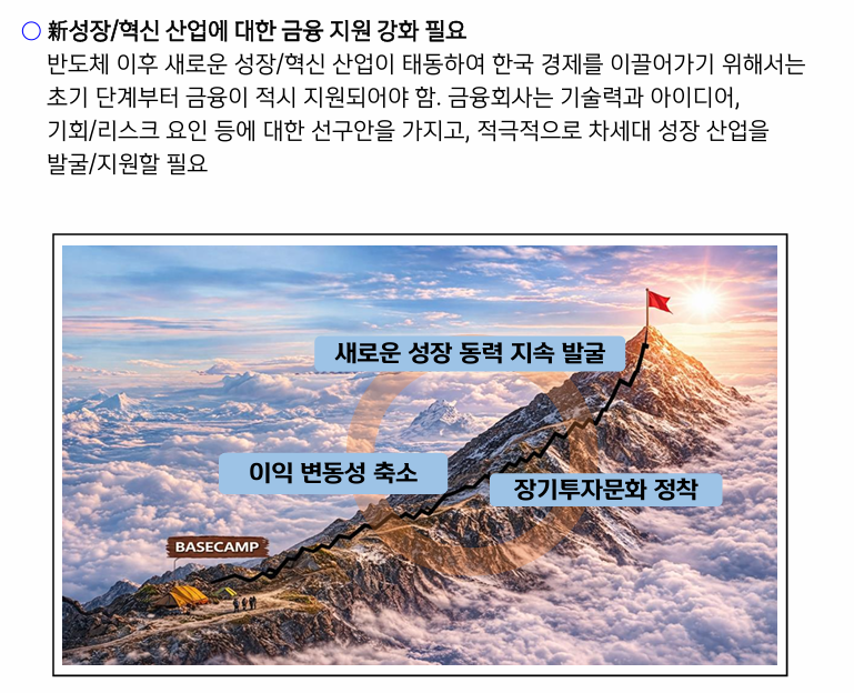 이를 위해 금융회사는 기술과 아이디어, 기회와 리스크를 선제적으로 식별하는 '선구안'을 바탕으로 산업 초기 단계부터 금융이 연계되는 실질적 지원 역할을 수행해야 한다고 제언했다.