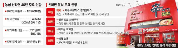 신라면의 성장세는 국내를 넘어 글로벌 시장으로 확장되는 추세다. 2015년 식품업계 단일 브랜드 최초로 누적 매출 10조원을 돌파했으며, 2021년에는 브랜드 전체 매출에서 해외 매출 비중이 처음으로 50%를 돌파했다. 지난해 신라면 브랜드의 국내외 매출은 1조5400억원에 달한다. 지난 40년간 신라면 브랜드의 누적 판매량은 425억개를 넘어섰다.