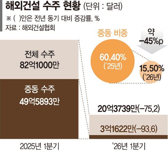 중동 시장은 플랜트, 도로, 전력 등 인프라 중심으로 국내 건설사들이 오랜 기간 주력해 온 최대 수주처다. 그러나 미국과 이란을 중심으로 한 전쟁이 지난 2월 말 본격화되면서 주요 프로젝트 발주가 줄줄이 지연됐다. 이라크 알포항만 후속 공사 등이 대표적인 사례로 꼽힌다.
