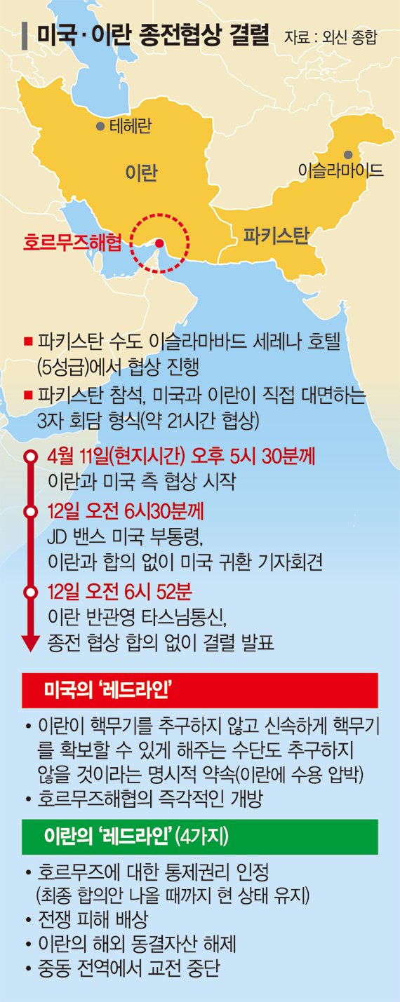 휴전 합의 나흘 만인 11일 양국 대표단은 이슬라마바드에서 대면 협상에 돌입했다. 전쟁 발발 이후 40여일 만이었다. 파키스탄이 중재 전면에 나섰고, 다급해진 중국까지 이란을 설득했던 것으로 알려졌다.