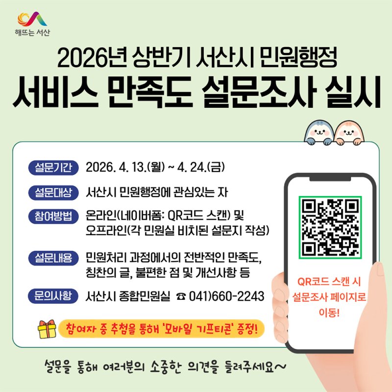 서산시는 13일부터 24일까지 '2026년 상반기 민원 행정 서비스 만족도 설문조사'를 실시한다고 밝혔다.