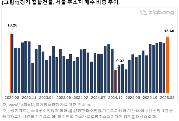 같은 기간 서울의 유입 흐름은 상대적으로 둔화되는 모습이다. 서울 집합건물을 매수한 수요 중 경기도 거주자 비중은 2025년 중반 16%대 수준에서 형성됐으나, 올해 3월에는 13.8%로 감소했다.