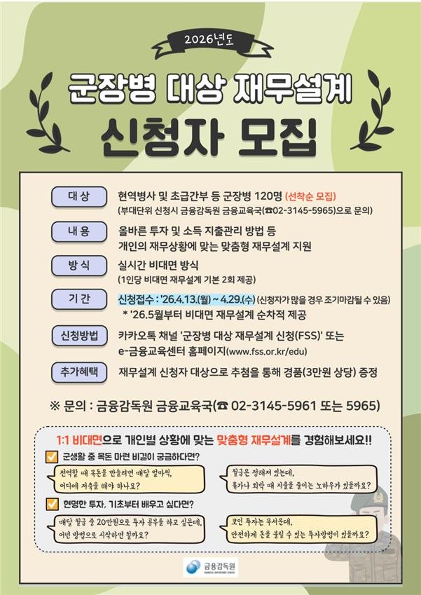 [파이낸셜뉴스] 금융감독원이 '군 장병 맞춤형 재무설계 서비스' 신청자 120명을 오는 29일까지 선착순 모집한다고 13일 밝혔다.