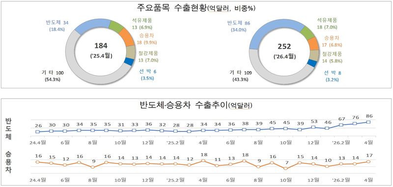 주요 수입 품목별로는 반도체(29.7%)와 원유(8.7%), 반도체 제조 장비(77.9%) 등이 증가했고, 기계류(-7.4%)는 감소했다. 원유·가스·석탄 등 에너지 수입액은 13.1% 증가했다. 특히 원유 수입액은 2월 20억 달러, 3월 23억 달러에 이어 4월 28억 달러로 석 달 연속 증가세를 이어갔다. 중동 사태에 따른 국제 유가 상승과 환율 영향 등의 영향으로 분석된다.