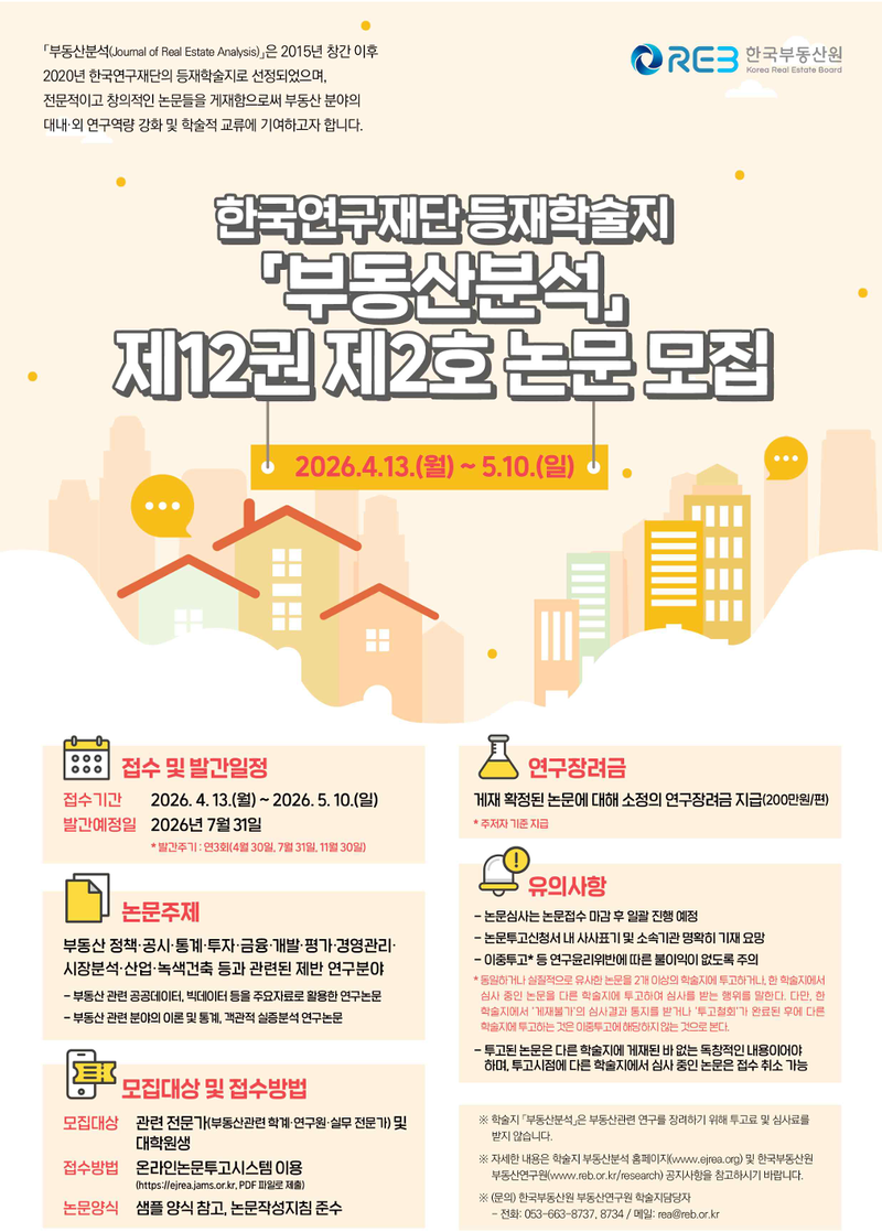 논문 주제는 부동산 정책·공시·통계·투자·금융·개발·평가·경영관리·시장분석·산업·녹색건축 등 전 분야로, 관련 전문가와 대학원생이면 누구나 투고할 수 있다.