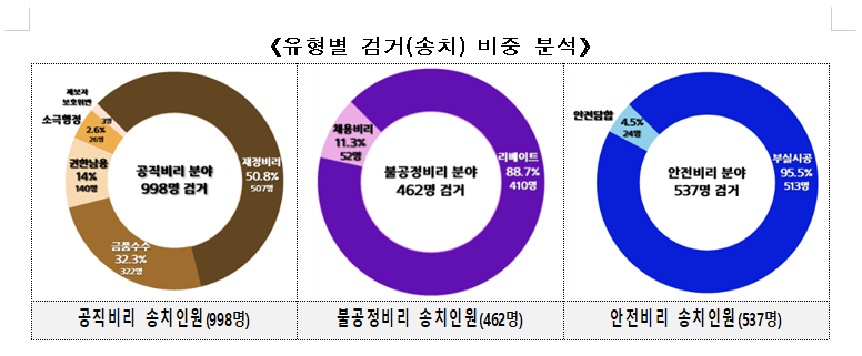 분야별로는 공직비리 사범 998명을 검거해 송치했고, 불공정비리 사범 462명, 안전비리 사범 537명도 각각 적발해 검찰에 넘겼다. 신분별로는 민간 분야가 1157명(구속 25명)으로 가장 많았고, 공직자 548명(구속 17명), 청탁·공여자 177명(구속 5명), 공무원 의제자 87명(구속 6명), 알선 브로커 28명(구속 3명) 순으로 나타났다.