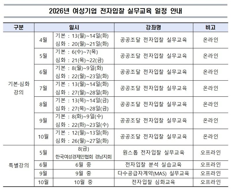 실무교육은 공공구매 시장 참여를 희망하지만 복잡한 입찰 절차와 데이터 분석에 어려움을 느끼는 여성기업인을 위해 마련됐다. 올해는 총 11회(온라인 7회·오프라인 4회) 운영한다.