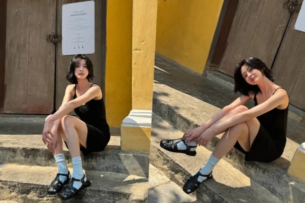 블랙 슬리브리스 원피스에 화이트 양말과 샌들을 매치한 심플한 스타일링이 돋보인다.