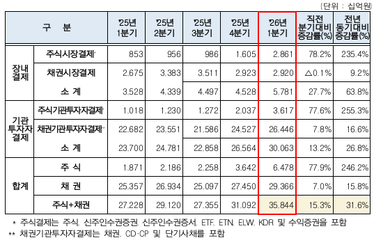 13일 한국예탁결제원에 따르면 올해 1·4분기 예탁결제원을 통한 증권결제대금이 일평균 35조8440억원으로 전년 동기(27조2280억원) 대비 31.6% 증가한 것으로 집계됐다. 직전분기(31조1000억원) 대비 15.3% 늘어난 수치다.