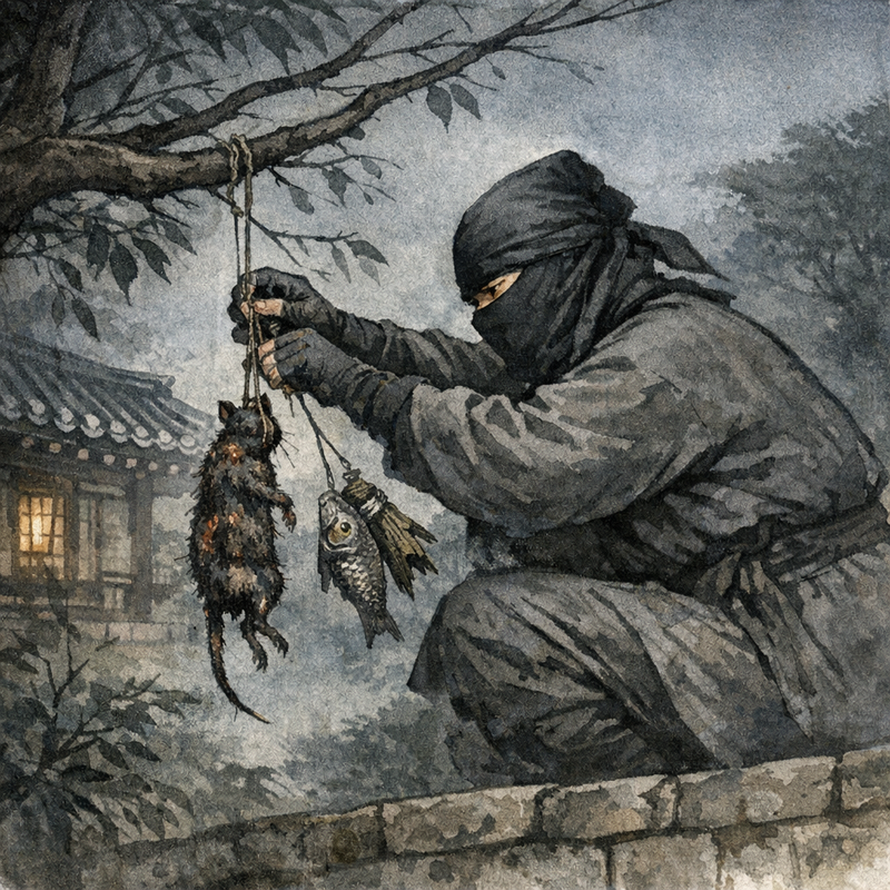 내은덕은 고개를 들어 본 순간, 숨이 멎었다. "……!" 당향목 가지 끝에 뭐가 검은 것이 매달려 있었다. 급히 볼일을 마치고 가까이 가서 살펴보았다. 바로 쥐였다. 그을린 귀와 주둥이, 반쯤 잘린 꼬리. 은덕은 놀라 한동안 말을 잇지 못하다가, 이내 서둘러 자리를 떴다.