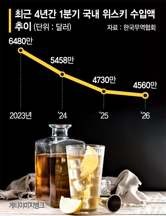 13일 식품의약품안전처 수입식품정보마루와 한국무역협회에 따르면 스카치 위스키와 아메리칸 위스키의 부진 여파로 국내 전체 위스키 수입액이 지속적인 감소세를 보이고 있다. 최근 4년간 1·4분기 기준 전체 위스키 수입액은 2023년 6480만달러에서 2024년 5458만달러, 2025년 4730만달러로 줄어들더니 올해는 4560만달러에 그쳤다.