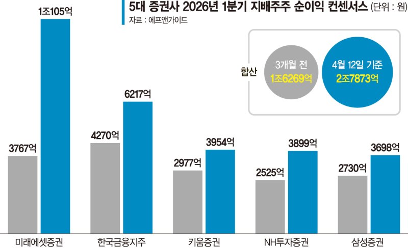 13일 금융정보업체 에프앤가이드에 따르면 미래에셋증권·한국금융지주·키움증권·NH투자증권·삼성증권 등 5대 증권사의 올해 1·4분기 지배주주 순이익 컨센서스(시장 평균 전망치)는 2조7873억원으로 집계됐다. 3개월 전 1조6269억원 대비 71.33% 급증한 수치다.
