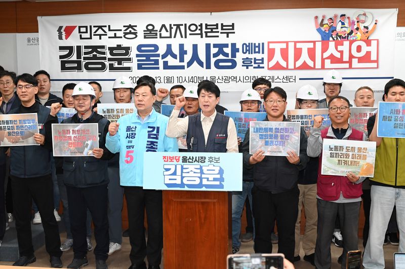 민주노총 울산지역본부는 13일 울산시의회 프레스센터에서 기자회견을 열고 "노동자의 도시 울산에서 미래를 지키는 선택은 김종훈 진보당 후보"라며 지지를 선언했다.